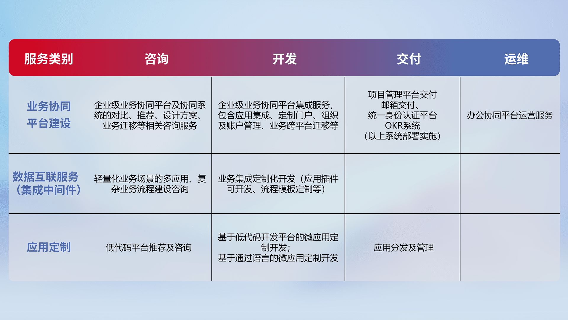 针对钉钉、、企微、、IDaas等平台级产品提供产品的规划、、方案、、、、交付、、定制化开发等服务,,实现如统一协同办公、、智能客户服务、、混合会议管理、、、智能数据查询、、等业务场景,,,,实现数字化转型。。。